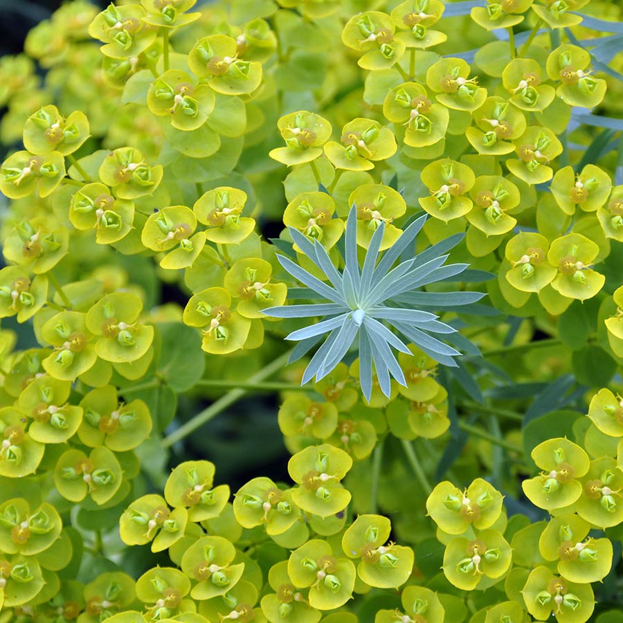 Etwas später blühende Euphorbien prägen den Garten auch aufgrund ihrer stattlichen Größe von rund 140 cm. Wieder andere warten bereits im Frühjahr mit leuchtend orangeroten Hochblättern und/oder in Orange oder Rot erglühenden Trieben auf, ehe sie sich im Herbst komplett verfärben. An ein Miniaturfeuerwerk oder einen locker gebundenen Blumenstrauß erinnert die am spätesten blühende Art: die Steppen-Wolfsmilch (Euphorbia seguieriana) mit ihrem nadelartigen blaugrünen Laub und den farblich stark abgesetzten gelbgrünen Hochblättern.