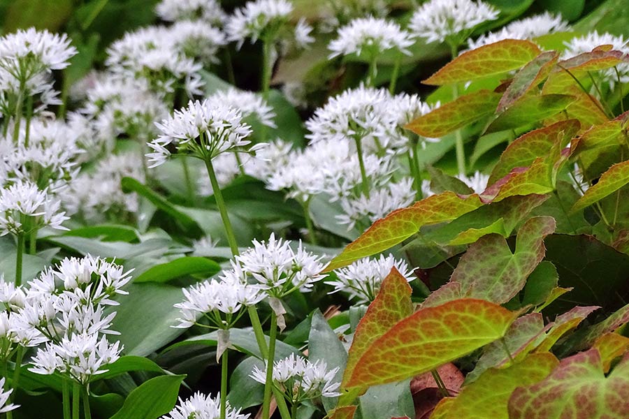 Schon aus einiger Entfernung offenbart sich zudem ihr Zierwert als Spezialisten für den Halbschatten und Schatten: Bereits im Jahr nach der Pflanzung bilden die gelb- bis olivgrünen, oft rotgerandeten oder mit einem filigranen rötlichen Muster gezeichneten Blätter eine geschlossene Decke – je nach Art als rundlicher Blatthorst oder flächig wachsend. Dadurch ergeben sich viele Kombinationsmöglichkeiten mit anderen Schattenstauden wie Farnen, Gräsern, Salomonssiegel (Polygonatum), Kaukasusvergissmeinnicht (Brunnera), Sterndolde (Astrantia) oder der exotisch anmutenden Lilientraube (Liriope).