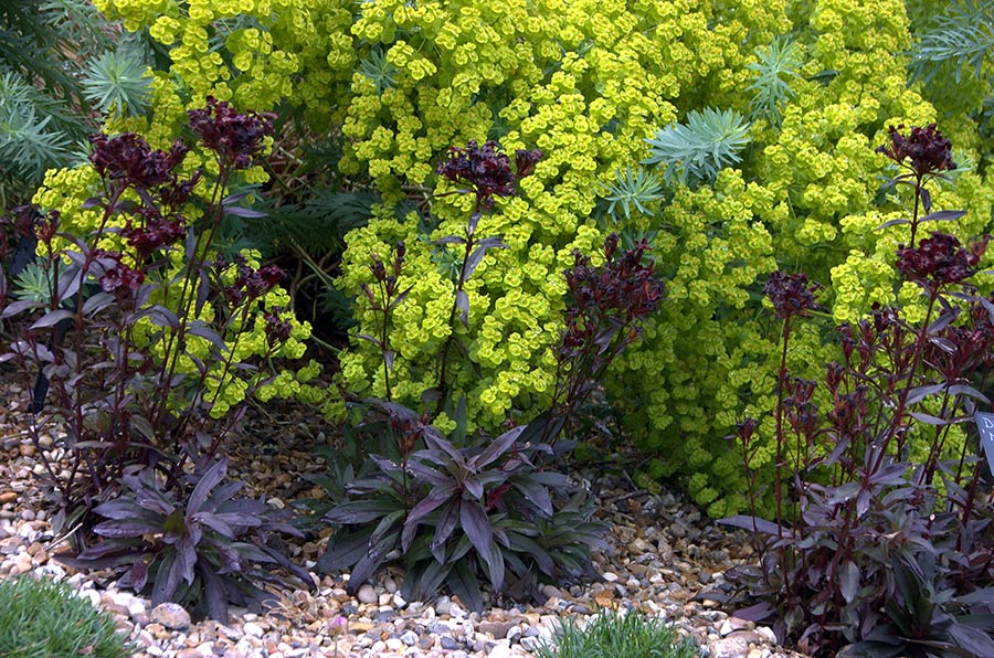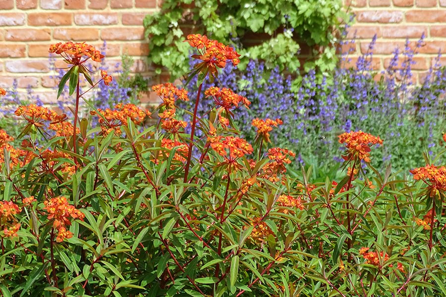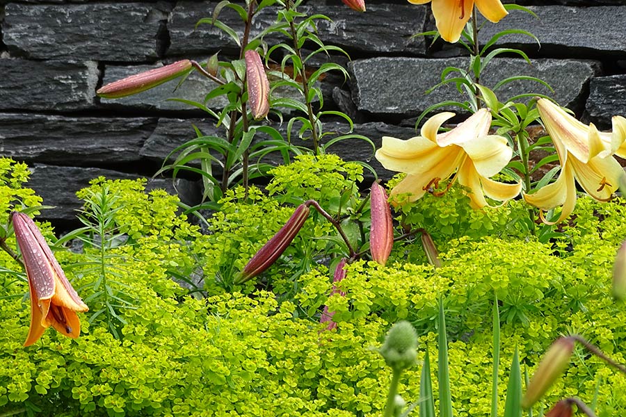 Etwas später blühende Euphorbien prägen den Garten auch aufgrund ihrer stattlichen Größe von rund 140 cm. Wieder andere warten bereits im Frühjahr mit leuchtend orangeroten Hochblättern und/oder in Orange oder Rot erglühenden Trieben auf, ehe sie sich im Herbst komplett verfärben. An ein Miniaturfeuerwerk oder einen locker gebundenen Blumenstrauß erinnert die am spätesten blühende Art: die Steppen-Wolfsmilch (Euphorbia seguieriana) mit ihrem nadelartigen blaugrünen Laub und den farblich stark abgesetzten gelbgrünen Hochblättern.
